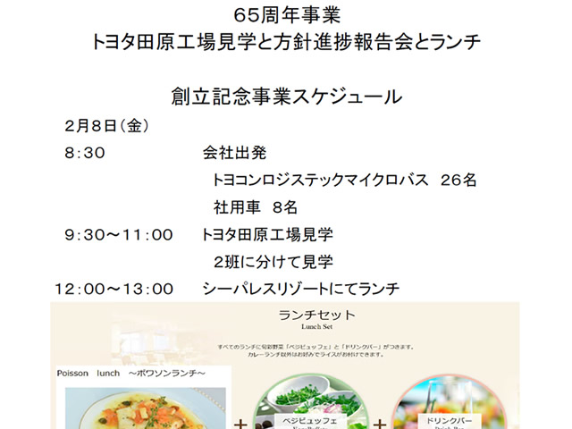 65周記念事業として社員全員でトヨタ田原工場見学と半期進捗報告会を兼ねてランチをしてきました。